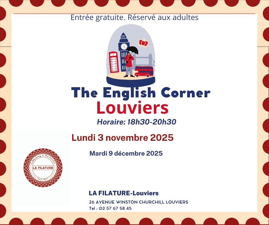 Mais également une fois par mois nous vous proposons notre English Corner de 18h30 à 20h30.